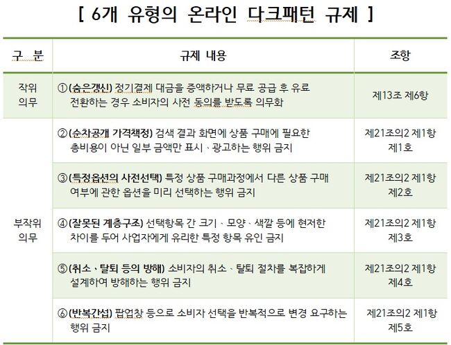 • - 온라인 다크패턴 6개 유형 적용 기준 명확화
