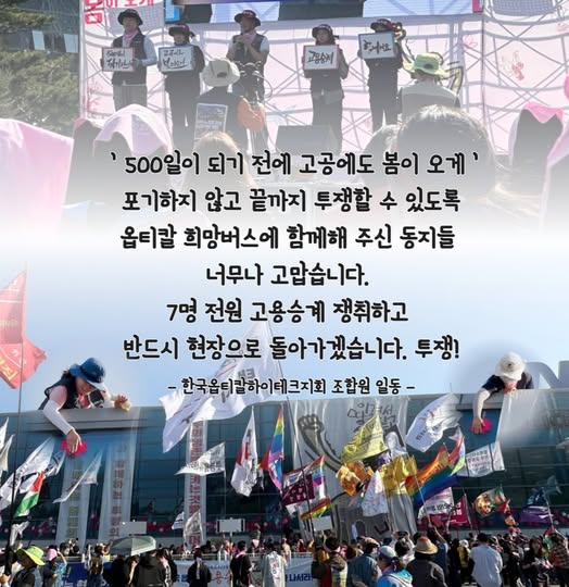 한국옵티칼하이테크지회고공에 매달렸던 사람이 600일 만에 지상으로 돌아왔다. 억지 해고로 올라갔고 회사의 외면과 정치권의 무관심으로 인해 농성을 지속해야 했다.