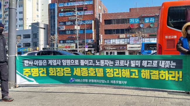 그리고 세종호텔 앞 도로 위 10여 미터 높이의 폭 좁은 가설물에는 여전히 서울 세종호텔지부 '후지야'의 주방장이던 고진수 씨가 아직도 아슬아슬하게 서 있다. 바로 아래로 차들이 계속 지나다니는 위태로운 자리다. 그 역시 해고노동자다.