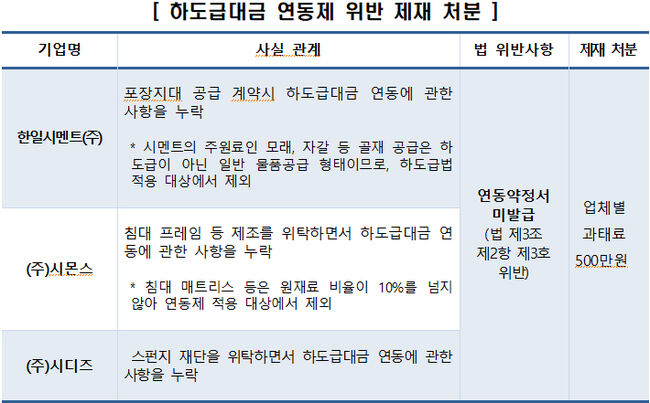 공정거래위원회가 일정 비율 이상의 원재료 가격 변동에 따른 하도급 대금 조정 내용을 계약서에 적지 않은 한일시멘트와 시몬스, 시디즈에게 각각 과태료 500만 원을 부과했다.