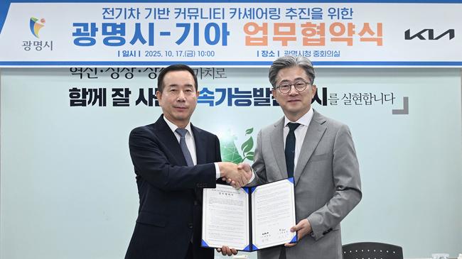 기아가 광명시와 손잡고 전기차 기반 '커뮤니티 카셰어링' 사업을 시작한다. 17일 양 측이 '전기차 기반 커뮤니티 카셰어링 추진을 위한 업무협약을 한 것이다.
