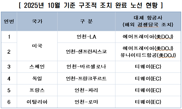 올해 10월까지 인천-LA, 인천-샌프란시스코, 인천-바르셀로나, 인천-프랑크푸르트, 인천-파리, 인천-로마 등 6개 노선에서 슬롯과 운수권 이전이 완료됐다. 이들 노선은 한국뿐 아니라 해외 경쟁당국들도 이전 처분을 내려 우선적으로 조치가 이뤄졌다.