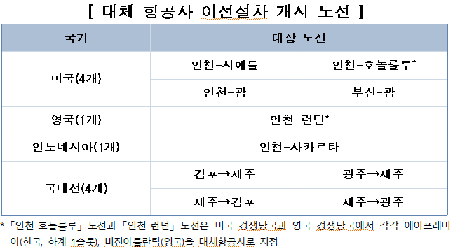 이전 절차가 개시되는 노선은 인천-호놀룰루, 인천-런던을 포함한 10개 노선이다. 인천-호놀룰루 노선은 미국 경쟁당국이 에어프레미아를 대체 항공사로 지정했고, 인천-런던 노선은 영국 경쟁당국이 버진아틀란틱을 선정했다.