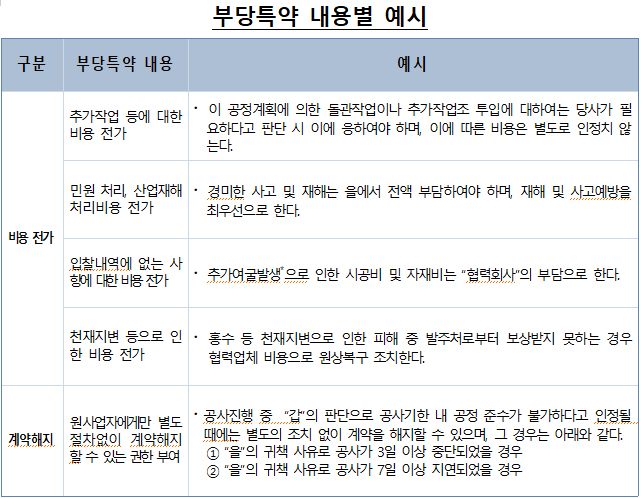 수급사업자에게 산업재해 처리, 민원 처리, 추가 돌관작업, 입찰내역에 없는 추가 굴착, 홍수 등 천재지변 복구 비용들을 귀책 여부와 관계없이 모두 떠넘겼다.