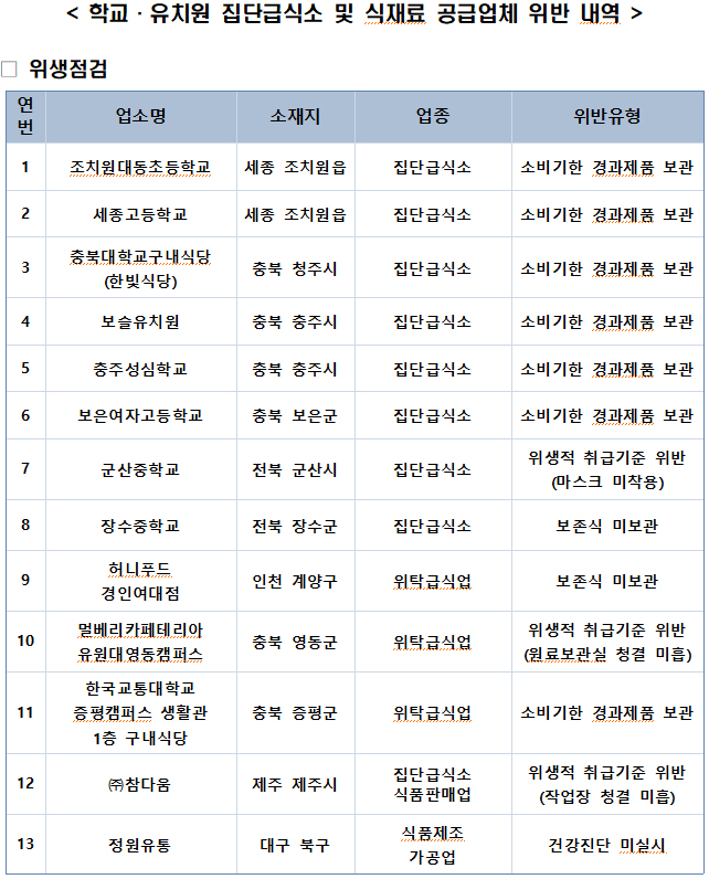 세종 조치원대동초, 세종고, 충북대 구내식당, 보슬유치원, 충주성심학교, 보은여고, 한국교통대 증평캠퍼스 구내식당 등 7곳이 명단에 올랐다.