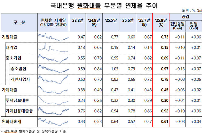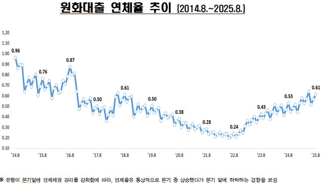 금융감독원이 23일 발표한 '25.8월말 국내은행의 원화대출 연체율 현황(잠정)'에 따르면 국내은행의 원화대출 연체율(1개월 이상 원리금 연체)은 0.61%였다.