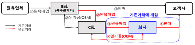 기존에는 B사가 고객사 발주를 받아 C사에 임가공을 맡기는 구조였으나, 웰바이오텍이 중간에 형식적으로 끼어들어 고객 발주를 받는 것처럼 거래 구조를 바꿨다.