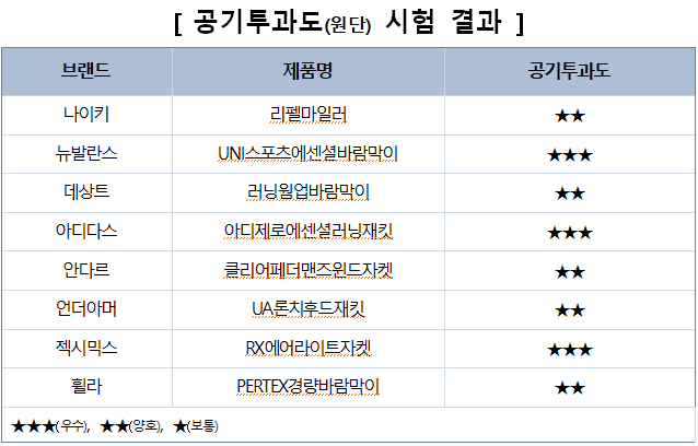 바람이 부는 환경(1.8m/s)에서 체온을 잘 유지하는 '체온유지성'은 나이키, 데상트, 안다르, 언더아머의 4개 제품이 상대적으로 '양호(★★)' 평가를 받았다.