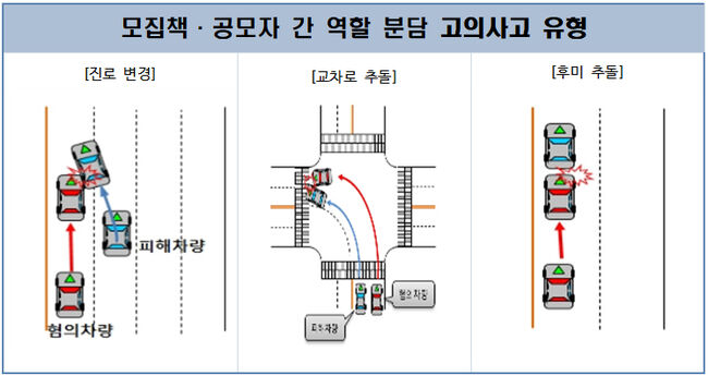 범행 수법은 대담했다. 이들은 진로를 변경하는 차량을 고의로 들이받거나, 교차로에서 신호 위반 차량을 노려 추돌하는 등 사전에 약속된 시나리오대로 사고를 냈다. 렌터카를 이용하기도 했다.