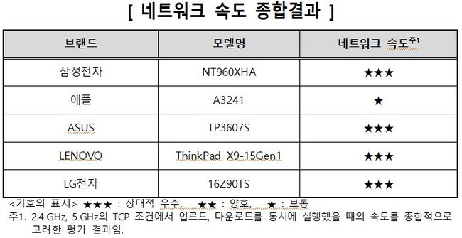 와이파이 송수신 속도를 측정하는 네트워크 테스트에서 삼성, ASUS, 레노버, LG 4개 제품이 '우수'를 받았는데, 애플만 '보통'을 받았다. 폐쇄적인 생태계 특성 탓인지, 범용 네트워크 환경에서 순수 속도가 타사에 밀리는 모습을 보였다.