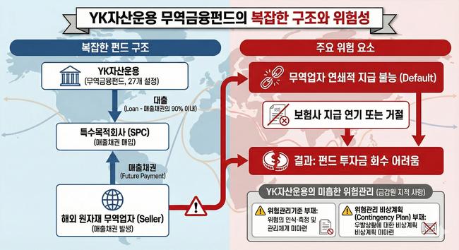 그런데 YK자산운용은 12개 해외 무역금융펀드에서 돈을 빌려간 SPC가 원리금을 연체해 사실상 '부실' 상태였음에도, 모른 척했다.