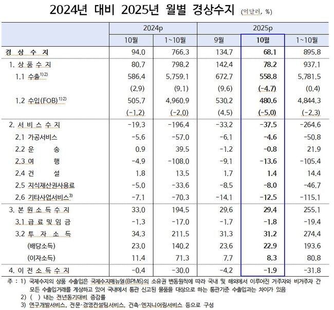 한국은행이 5일 발표한 '2025년 10월 국제수지(잠정)'에 따르면, 10월 경상수지는 68억1,000만 달러 흑자를 기록했다.