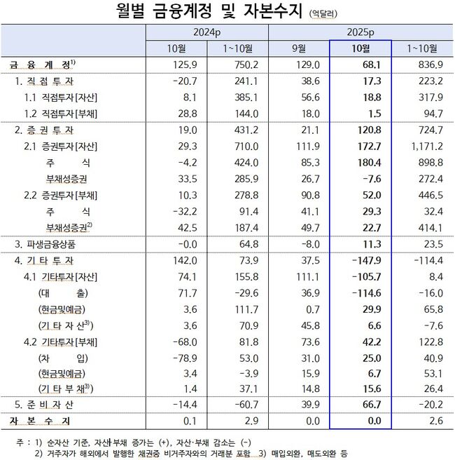 돈의 흐름을 보여주는 금융계정에서는 순자산이 68억1,000만 달러 증가했다. 가장 눈에 띄는 대목은 '서학개미'들의 거침없는 행보다.