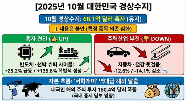 반도체와 조선업이 '형님 노릇'을 톡톡히 하며 흑자를 견인했지만, 믿었던 자동차와 철강 등 다른 주력 산업들이 맥을 못 추고 있기 때문이다.