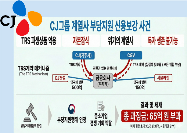 공정위가 CJ건설·시뮬라인 등 계열사를 TRS계약 방식으로 부당지원한 CJ 등에 과징금 65억 원과 함께 시정명령을 내렸다.