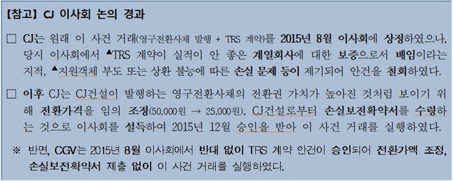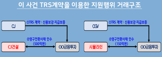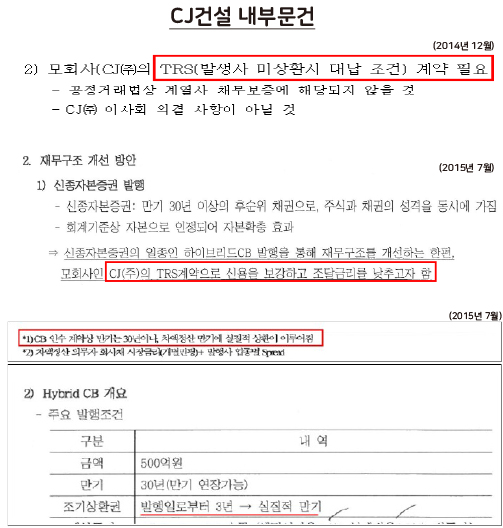 양측은 영구전환사채에서 손실이 나면 CJ가 물어주고, 이익이 나면 가져가는 TRS계약을 맺었다. 사실상 CJ건설의 신용 위험을 CJ가 전부 떠안은 셈이다.