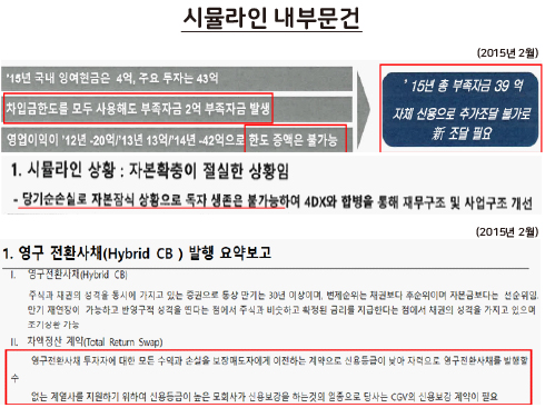 CGV도 같은 수법을 썼다. 자회사 시뮬라인이 발행한 150억 원의 영구전환사채 발행을 도왔다. 방식은 CJ건설 건과 판박이였다. CGV가 TRS계약을 통해 금융회사의 손실을 보전해 주기로 했다.