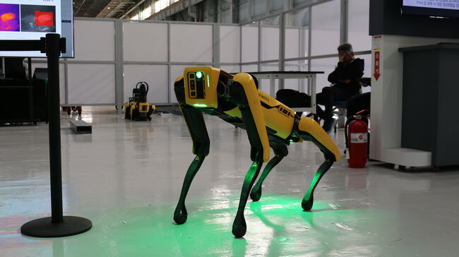 보스턴 다이나믹스의 4족 보행 로봇 'SPOT'이 공장을 다니며 센서로 설비 상태를 모니터링하고 있다