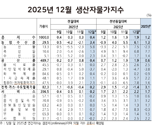 2025년의 마지막 달, 생산자물가가 다시 한번 들썩였다. 한국은행 발표 2025년 12월 생산자물가지수는 전월 대비 0.4% 상승하며 한 해를 마감했다. 전년 동월 대비 1.9% 오른 수치다.