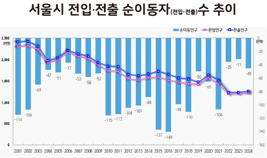 서울을 떠나는 사람들의 뒷모습이 눈에 띄게 줄었다. 2001년 75만1000명이었던 전출 인구는 2024년 47만3000명으로 급감했다. 순유출(들어오는 사람보다 나가는 사람이 많은) 구조는 여전하지만 그 규모는 2001년 11만 명대에서 2024년 4만 명대로 축소됐다.