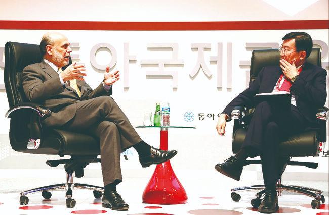 '2023동아국제금융포럼'에서 기조 강연자로 나선 더글러스 다이아몬드 시카고대 경영대학원 교수(노벨경제학상 수상)와 대담하는 전광우 이사장. [세계경제연구원 제공]