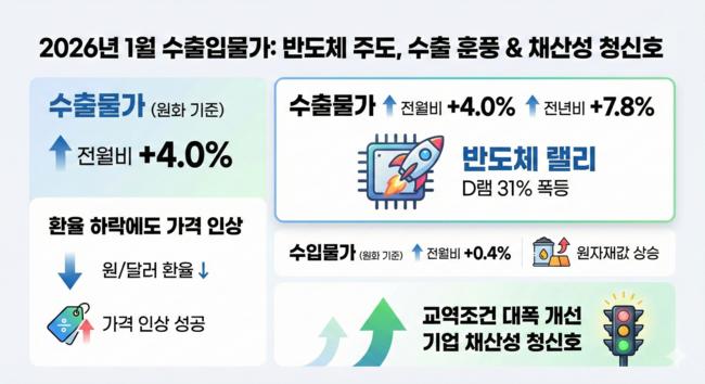 2026년 새해 첫 달. 대한민국 수출 전선에 훈풍이 불었다. 원/달러 환율 하락이라는 불리한 여건 속에서도 수출 물가가 4% 넘게 오르며 2년여 만에 가장 높은 상승률을 기록했다. 반도체를 필두로 한 IT 제품들이 글로벌 시장에서 몸값을 높이며 수출 물가 상승을 견인한 덕분이다.한국은행이 13일 발표한 '2026년 1월 수출입물가지수'에 따..