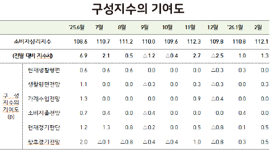 한국은행이 24일 발표한 '2026년 2월 소비자동향조사 결과'에 따르면 소비자심리지수(CCSI)는 112.1을 기록했다. 1월 110.8에서 1.3p 상승한 수치다.