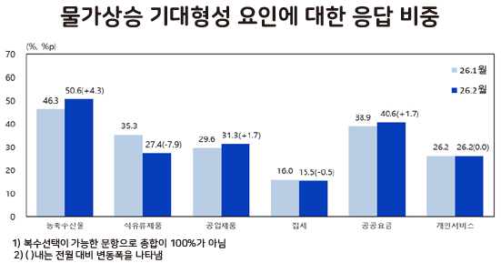 물가 상승에 영향을 미칠 주요 품목으로는 농축수산물이 50.6%의 응답 비중을 차지했다. 전월보다 4.3%p나 상승했다. 공공요금(40.6%)과 공업제품(31.3%)이 뒤를 이었다. 반면 석유류제품 비중은 27.4%로 전월 대비 7.9%p 하락했다.