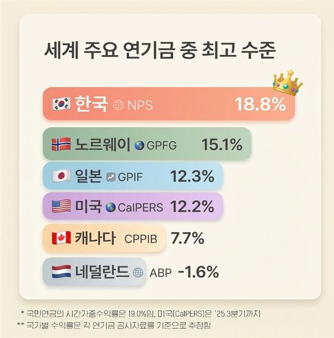 국민연금의 시간가중수익률 기준 수익률은 19.0%다. 노르웨이 국부펀드(GPFG) 15.1%, 일본 공적연금(GPIF) 12.3%, 캐나다 연금투자위원회(CPPIB) 7.7%를 크게 앞질렀다. 심지어 네덜란드 연기금(ABP)은 -1.6%로 역성장했다. 전 세계 연기금 중 최고 수준의 성과다.