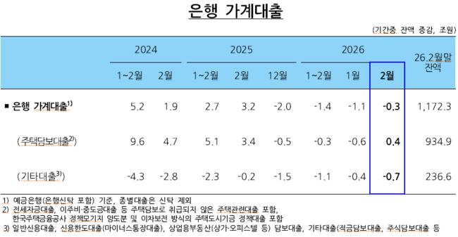 가계 빚은 점진적인 다이어트 흐름을 이어갔다2월 은행 가계대출은 3000억 원 줄어들며 1월 1.1조 원 감소에 이어 3개월 연속 몸집을 줄였다기타대출은 명절과 성과 상여금 유입 덕분에 0.7조 원 감소해 전월 대비 감소 폭을 키웠다