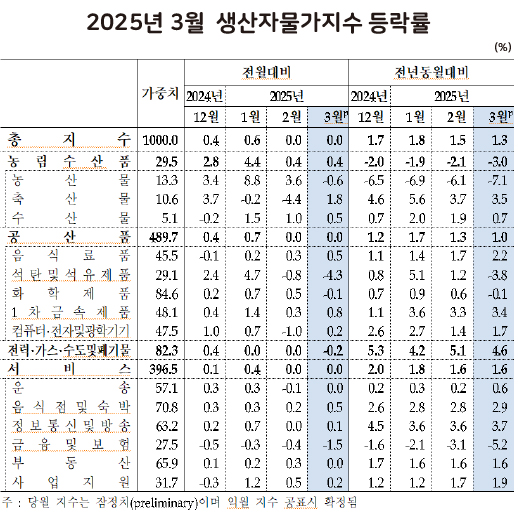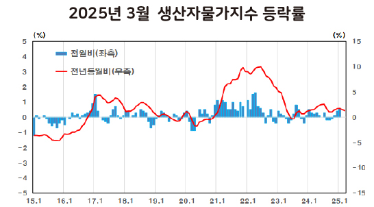 [한국은행 생산자물가지수] 한국은행이 발표한 '2025년 3월 생산자물가지수' 자료에 따르면, 지난달 생산자물가지수는 한 달 전과 비교해 변동이 없는 보합(0.0%)을 기록했다.(자료: 한국은행)봄기운이 완연한 3월, 소비자들의 장바구니 체감 온도는 엇갈렸다. 주유소 기름값은 조금 내렸지만, 저녁 밥상에 올릴 삼겹살과 달걀 가격이 오르며 서민들의 주름살을 늘렸다.