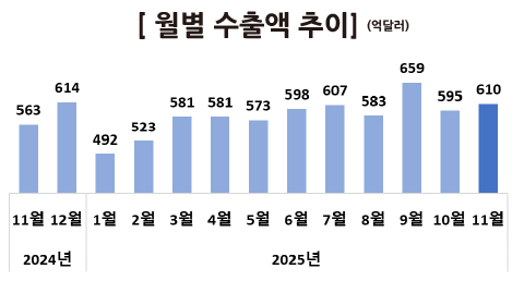 1일 산업통상자원부 발표 '2025년 11월 수출입 동향'에 따르면, 11월 수출액은 610억4,000만 달러로 전년 동월 대비 8.4% 증가했다.