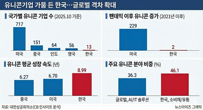 10월 기준 대한민국 유니콘기업은 13개였다. 미국은 717개였다.(뉴스아이즈 AI)
