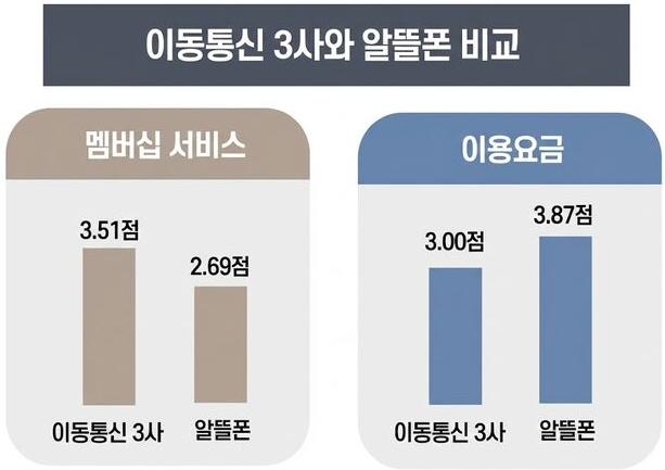 이제는 '가성비' 앞에서 통신 3사가 작아지고 있다. '이용 요금' 만족도에서 알뜰폰은 3.87점을 기록한 반면, 통신 3사는 3.00점에 그쳤다. 무려 0.87점 차이다.