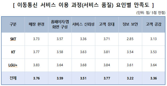 SKT는 '정보 보안' 항목에서 2.85점이라는 충격적인 점수를 받으며, 경쟁사(LGU+ 3.61점, KT 3.54점) 대비 현저히 낮은 신뢰도를 보였다.
