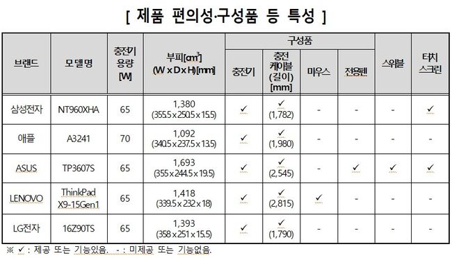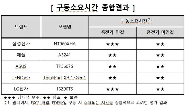 한국소비자원이 소비자 선호도가 높은 16인치급, 최신 CPU와 16GB램을 탑재한 인기 노트북 5종(삼성전자, 애플, ASUS, LENOVO, LG전자)을 선정해 테스트를 했다.