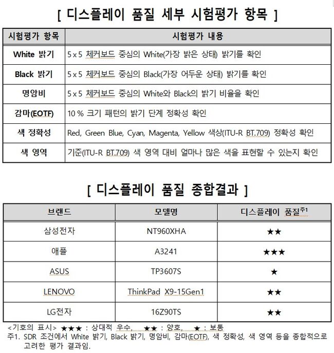 디스플레이 제왕은 애플이었다. SDR 환경에서 색 정확성, 명암비, 감마 등을 종합 평가한 결과에서 애플(A3241)이 유일하게 '상대적 우수(★★★)'를 받았다. 디자이너나 영상 편집자에게는 애플이 가장 안전한 선택지였다.