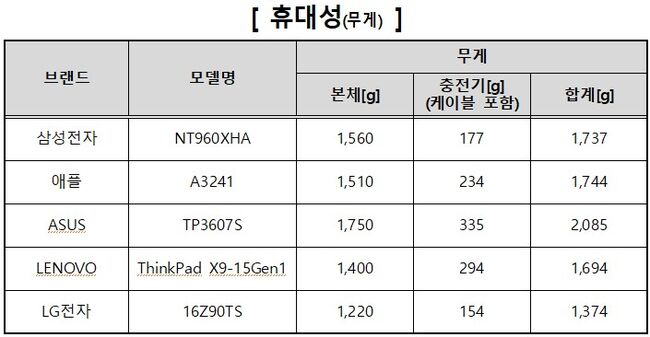 삼성전자와 애플은 본체와 충전기 합산 무게가 약 1.7kg대로 비슷했으나, 레노버(ThinkPad X9-15Gen1) 1,694g보다 조금 무거웠다.