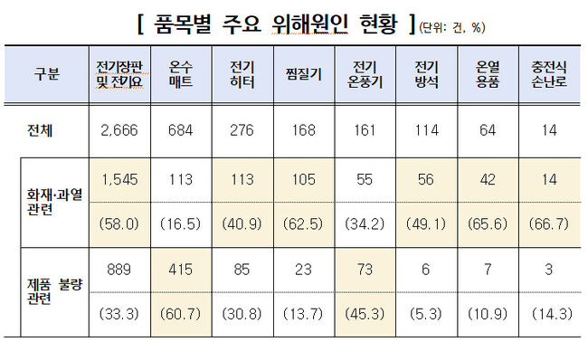 품목별로는 '전기장판 및 전기요'가 전체 사고의 64.2%(2,666건)를 차지해 압도적으로 많았고, 온수매트(16.5%), 전기히터(6.6%)가 뒤를 이었다.