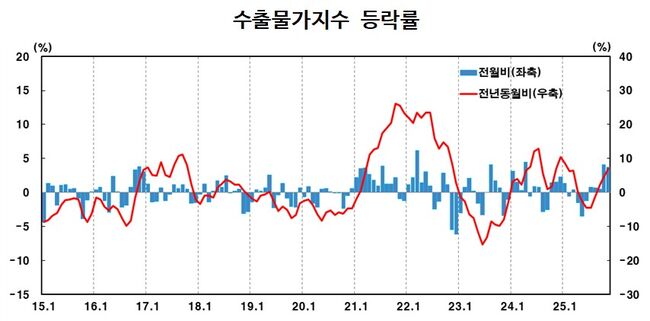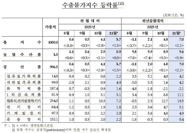 이 영향으로 원화 기준 수출물가는 전월 대비 3.7% 올랐지만, 환율 효과를 제거한 계약통화기준으로는 상승 폭이 1.5%에 그쳤다.