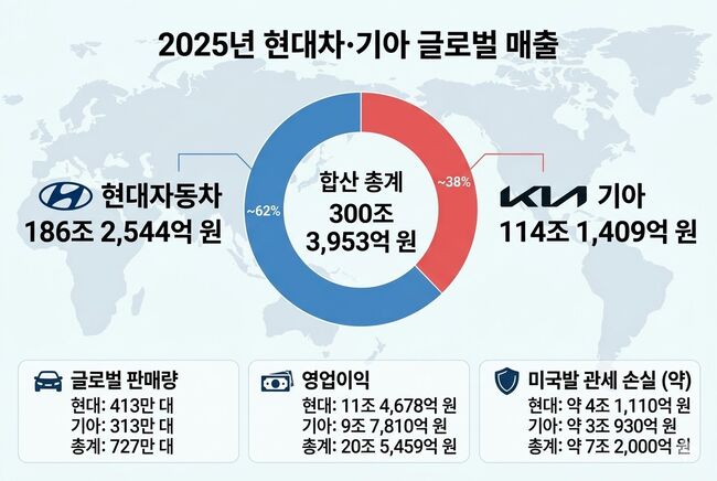 현대자동차그룹이 2025년 사상 처음 글로벌 합산 매출 300조 원 돌파를 발표한 데 이어, 미국 시장에서 138조 원의 매출을 올리며 폭스바겐을 제치고 글로벌 수익성 2위로 도약했다.(뉴스아이즈 AI)현대자동차와 기아가 1월 글로벌 합산 매출 300조 원 시대를 선언한 가운데, 미국 사업이 그룹 전체의 폭발적인 성장을 이끄는 최대 수익 거점으로 확인됐다.
